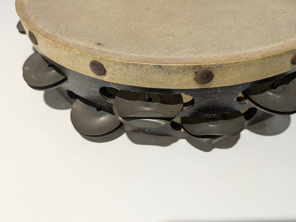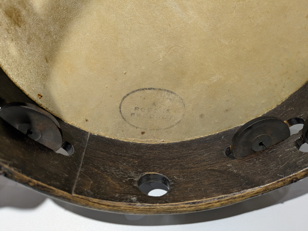 タンバリン裏面の**「a rogers product tambourine」のロゴは一部かすれが見られます**。