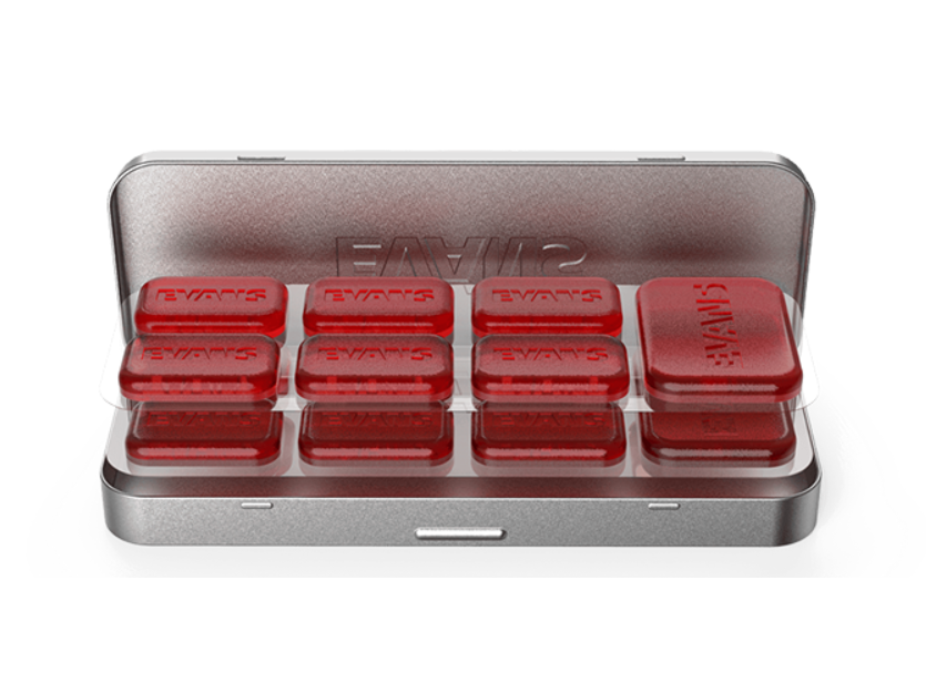 エンボス式に EVANS ロゴの入った上面はテフロン加工が施され、汚れがつきにくい他、形状の維持もしやすいデザインとなっており、ドラムやシンバルなどへ貼ったり剥がしたりすることができます。